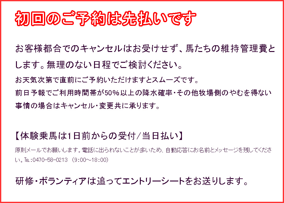 体験乗馬【1日前から予約受付/当日払い】(10週/4歳~60代まで・70㎏以下)基礎練習(130㎝以上60代まで・70㎏以下)外乗(130cm以上60歳以下/65㎏まで)ご宿泊・牧場ハウスご宿泊・ロフトその他